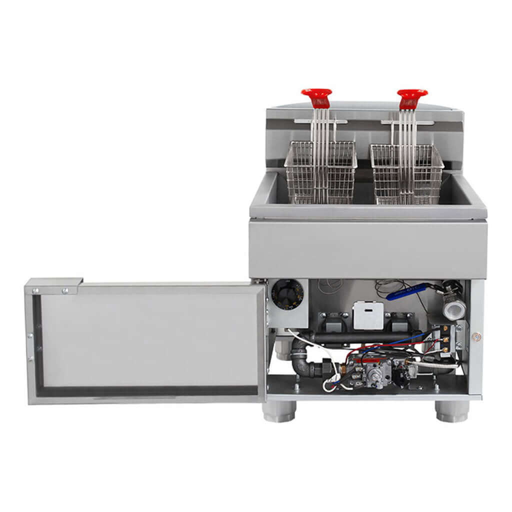 Porque combina potencia, control y facilidad de limpieza para una operación diaria más rápida. Sus quemadores de alta eficiencia recuperan temperatura en poco tiempo, lo que se traduce en tandas más ágiles y mejor textura en cada fritura.