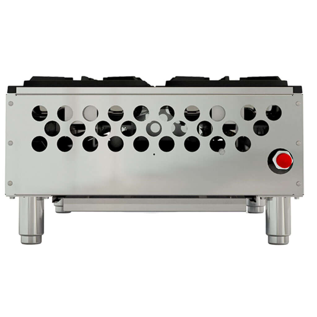 Integra pilotos individuales, válvulas certificadas para uso comercial y perillas con aislamiento térmico para operación cómoda durante jornadas intensas. Además, cuenta con charola para captar escurrimientos y mantener el área de trabajo más limpia.