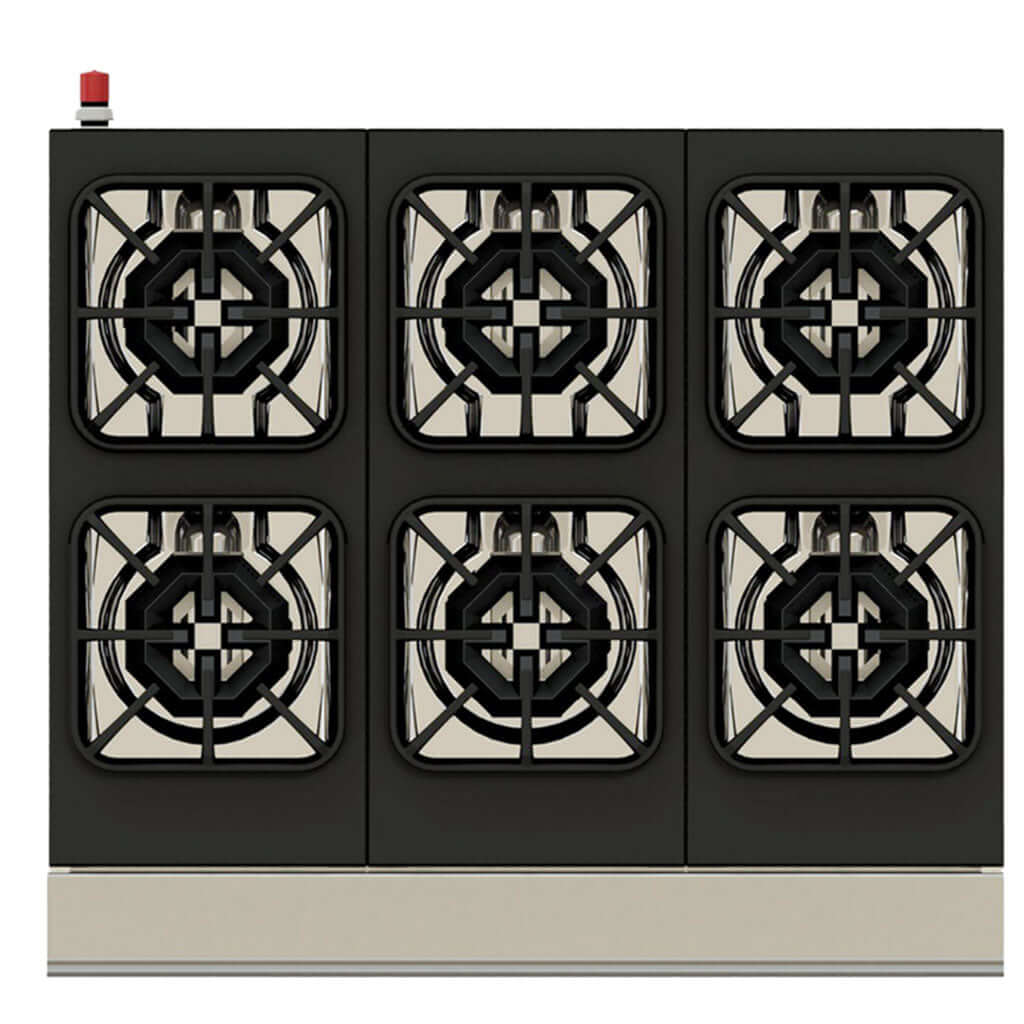 - 6 quemadores octagonales sólidos en hierro fundido de 24,000 Btu/hr c/u.